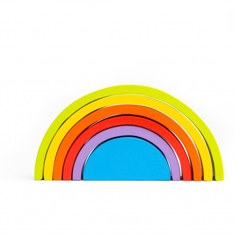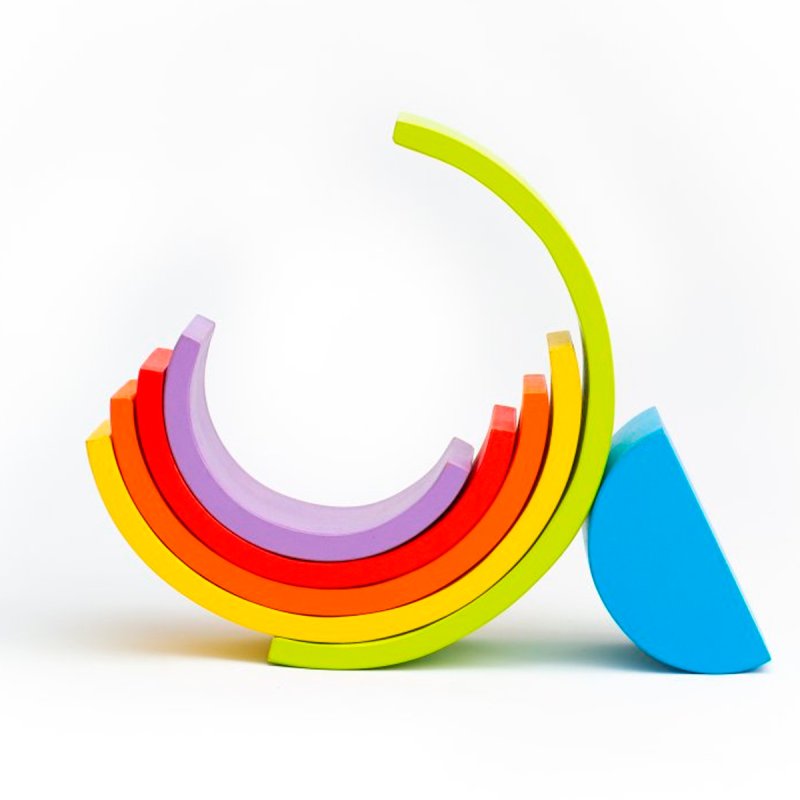 Y tantas otras cosas por descubrir con el ARCOÍRIS DE 6 PIEZAS. Sumergidos en la simpleza del arcoíris nos adentramos a un mundo mágico, descubriendo un amplio abanico de posibilidades por su gran versatilidad, dado que sus piezas pueden ser apiladas, ordenadas por tamaño, alineadas, y con ellas construir innumerables escenarios de mayor tamaño que recreen historias de la vida real (pueden ser puentes o túneles para los autos, torres, montañas, casas para los muñecos, laberintos de bolitas) fomentando el juego simbólico, la creatividad y la imaginación. Sus piezas pueden apoyarse desde diferentes bases otorgando la posibilidad de construir figuras tanto bi como tridimensionales, de gran altura o superficie. Fomenta la estimulación de funciones cognitivas como el uso de la lógica, la concentración, la atención, la resolución de problemas, presentándose desafíos de equilibrio y contrapesos en las construcciones. Es un producto tan versátil que se complejizará a medida que el niño crezca y desarrolle habilidades.